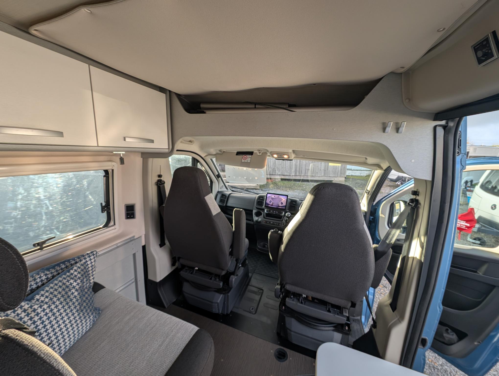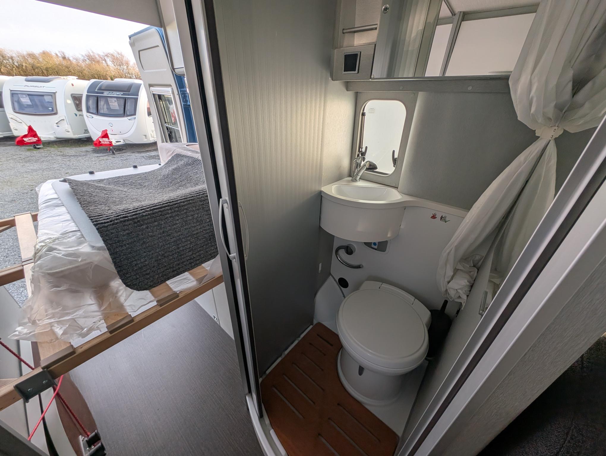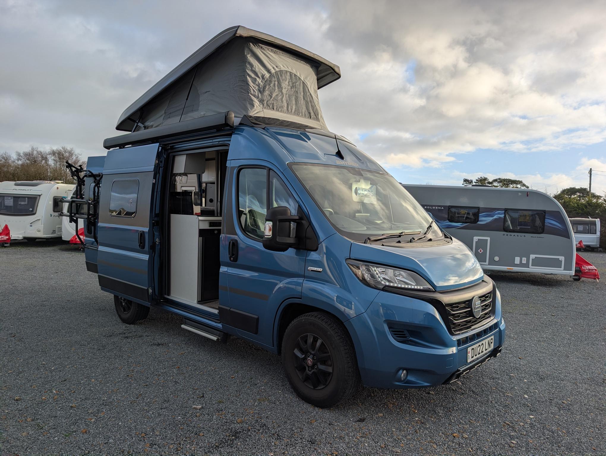 We are delighted to present to the market this gorgeous eye catching Blue Hymer Panel van. The Cab benefits from air conditioning, cruise control, Media player with sat nav and bluetooth, black out blinds and cup holders. Very spacious and well laid out for a 5.4m van, pop roof creates added height around the lounge/Dining area. Extras include Wind out canopy awning. Heating and hot water can be run off the gas and electric. 2 x Gas ring burner, Sink with hot and cold running water from on board water tank, 12 v fridge, generous storage and plenty of good lighting and power sockets. Sleeping – Very comfortable rear transverse double bed, Double bed in the pop roof with memory foam mattress. Living – Front dinette area with 2 x swivel cab chairs comfortably sitting 4 adults. Bathroom: Sink with hot and cold running water, tap extends into a shower head, electric flush toilet and storage cupboard.