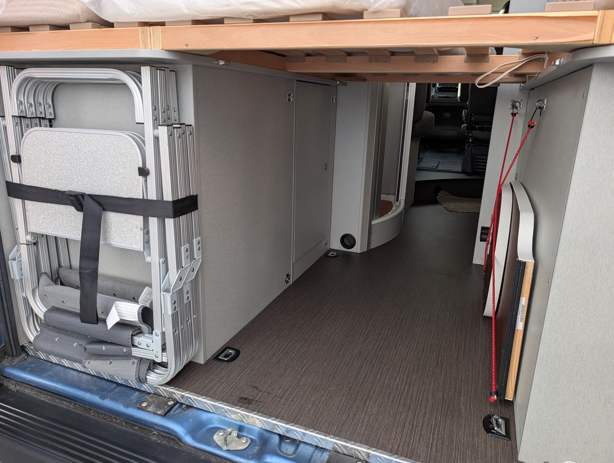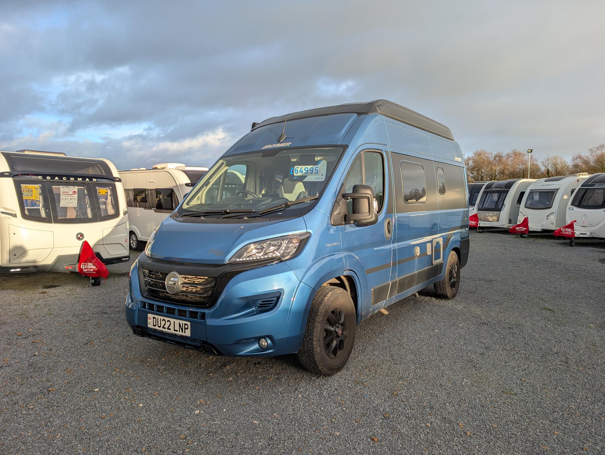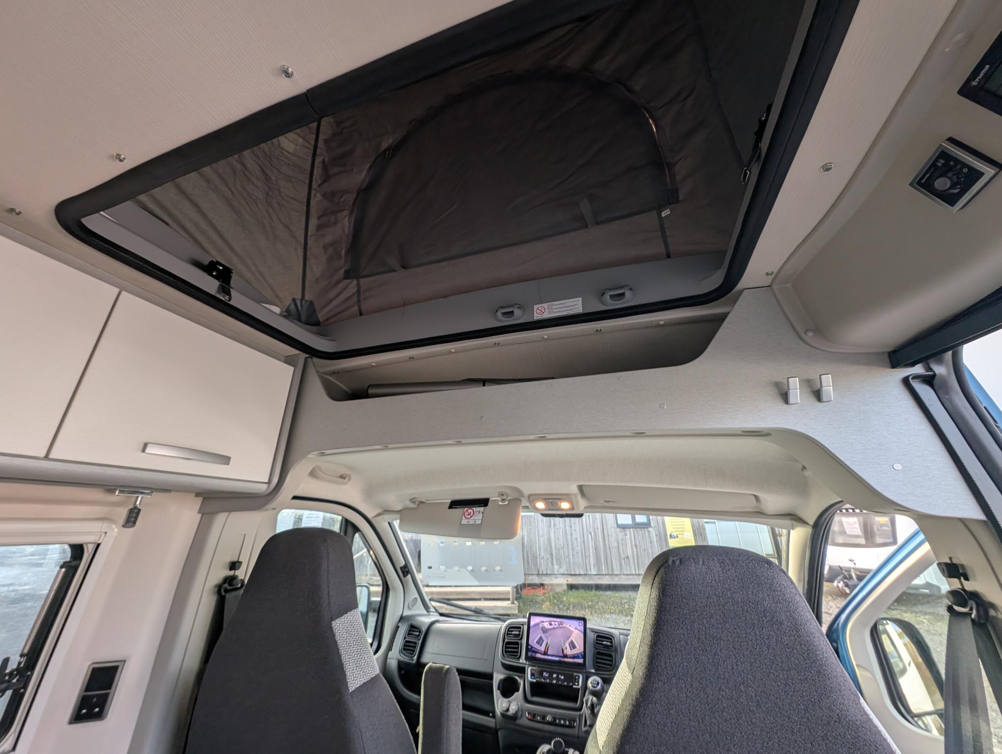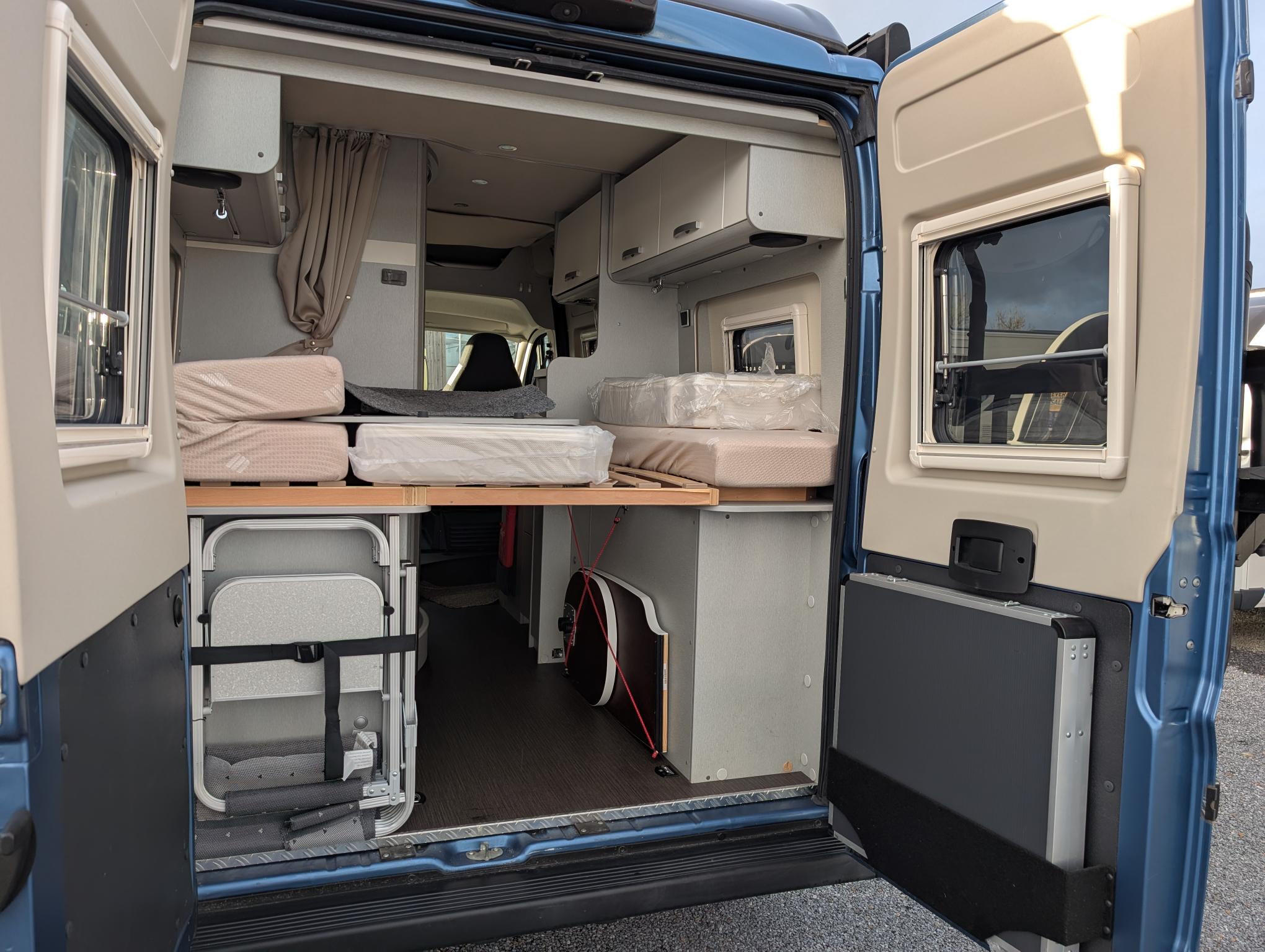 We are delighted to present to the market this gorgeous eye catching Blue Hymer Panel van. The Cab benefits from air conditioning, cruise control, Media player with sat nav and bluetooth, black out blinds and cup holders. Very spacious and well laid out for a 5.4m van, pop roof creates added height around the lounge/Dining area. Extras include Wind out canopy awning. Heating and hot water can be run off the gas and electric. 2 x Gas ring burner, Sink with hot and cold running water from on board water tank, 12 v fridge, generous storage and plenty of good lighting and power sockets. Sleeping – Very comfortable rear transverse double bed, Double bed in the pop roof with memory foam mattress. Living – Front dinette area with 2 x swivel cab chairs comfortably sitting 4 adults. Bathroom: Sink with hot and cold running water, tap extends into a shower head, electric flush toilet and storage cupboard.
