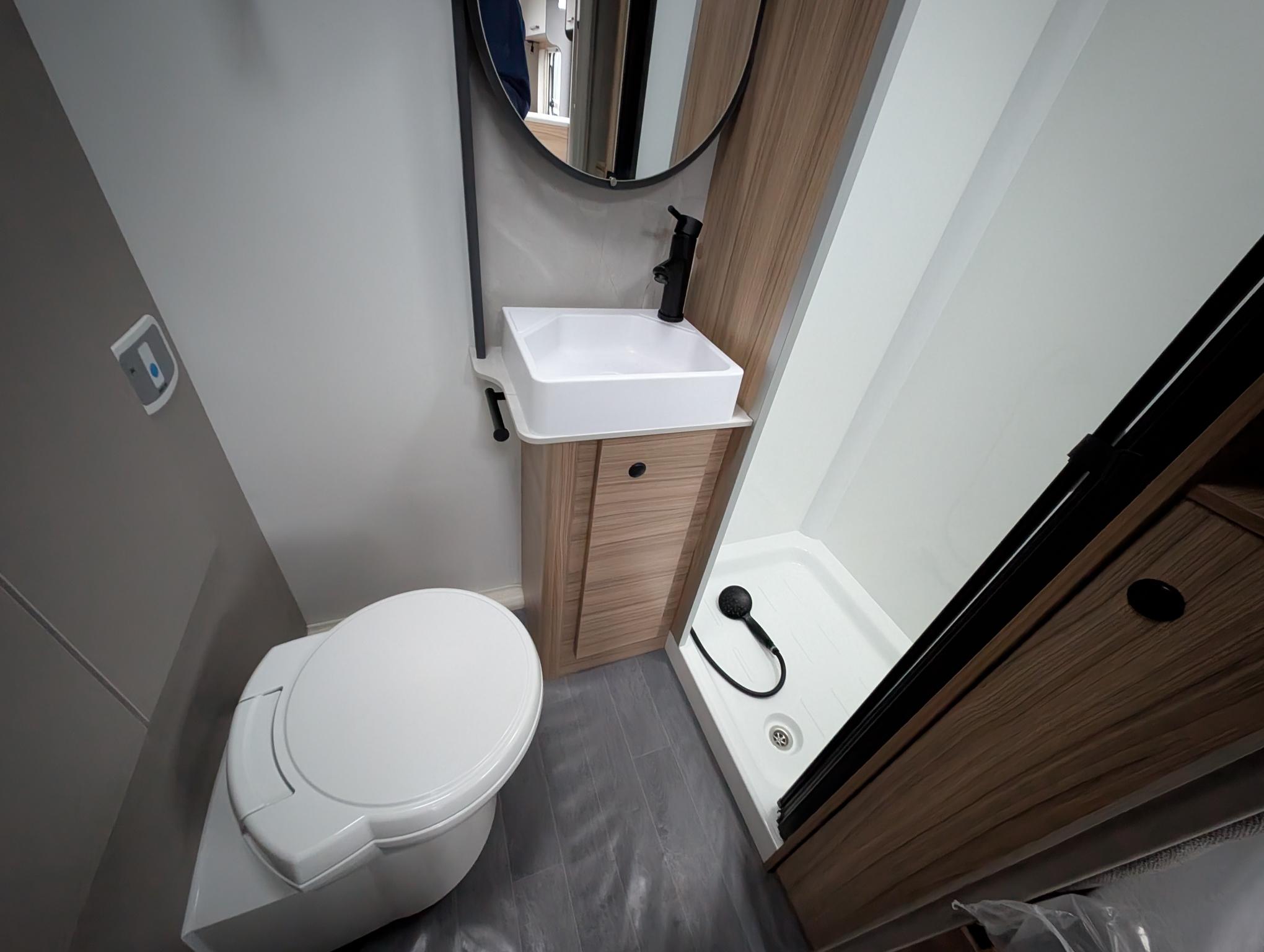Full-width end washroom with separate shower cubicle