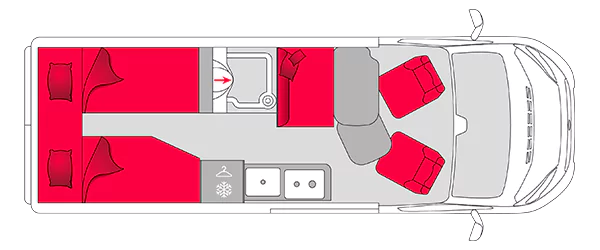 Only on the V633M : No window on rear doors, Large bedroom cupboard, Bunk beds